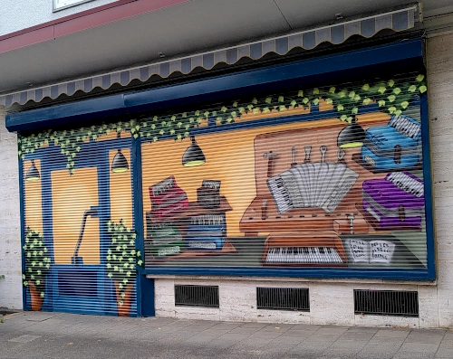 Auch von der Deko her gab es Farbtupfer in der Nüchternheit, wie zum Beispiel dieses Rollo vor einem Schaufenster. Oder wie diese Hausfassaden: