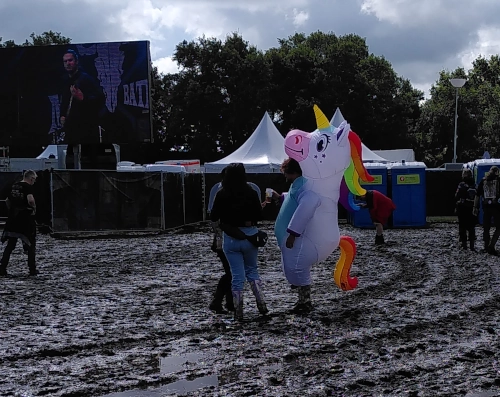 2025 gab es dann wieder reichlich Regen. Und entsprechend knöcheltiefen Schlick. Ich hatte zwar meine Einhornmütze dabei, aber bei dem Wetter hielt ich es nicht für sinnvoll, sie aufzusetzen. Die Person im aufblasbaren Einhornkostüm war da leidensbereiter. Dafür ist dieser Mensch auch in den Livestream-Videos von Magenta mehrfach zu sehen.