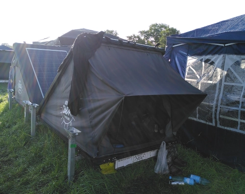 Auch dieses Jahr stand mein Zelt schon. Es war eine feste Klappbox auf einem Podest mit Solarplatte obendrauf. Das hieß, dass ich extrem großzügig mein Smartphone aufladen konnte. Das Zelt hatte außerdem innen eine LED-Lichterkette installiert, das war eine ganz andere Erfahrung als früher mit einer funzeligen Taschenlampe 😀