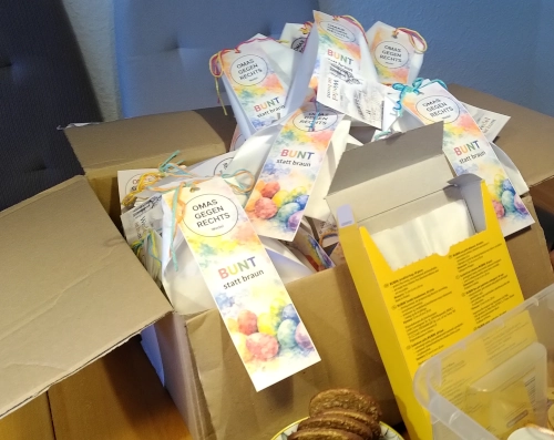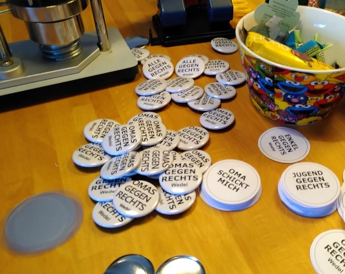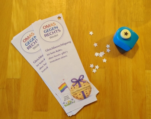 An einem weiteren Wochenende war Basteltag mit den Omas gegen Rechts in Wedel. Wir haben so lange Buttons gestanzt, bis die Folien aufgebraucht waren. Am goldigsten finde ich den Spruch „Oma schickt mich“ und ich hoffe, die Dinger werden gut weggehen. Genauso wie die Kekse, die zusammen mit Lesezeichen zum 8. März verteilt werden sollen. Ich hatte unter anderem die Aufgabe, Sternchen zum Festbinden zu lochen. Nettes Nebenprodukt: Eine ganze Handvoll Sternekonfetti. Im Leben dürfte es ruhig öfter mal Konfetti geben.