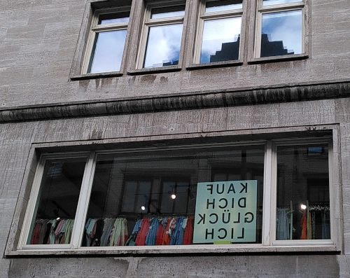 Der Demozug kam mir größer vor als im Januar, obwohl der HSV wieder spielte. Die Stimmung war gut, die Flaggen bunt und das Wetter immerhin trocken. Unterwegs fiel mir der Spruch ins Auge, den Shoppingfans in diesem Laden von innen richtig herum zu lesen bekommen. Bei mir funktioniert das Glücklich-Shoppen allerdings irgendwie nicht.