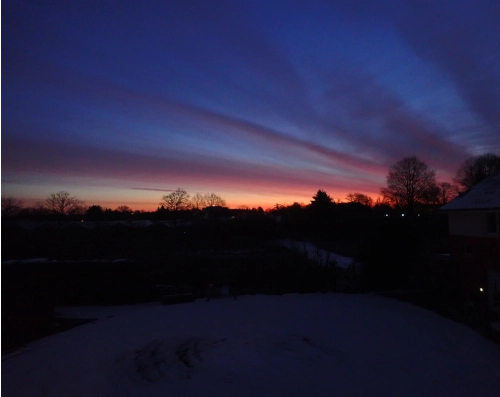 Die Sonne geht über einem verschneiten Wendehammer auf.